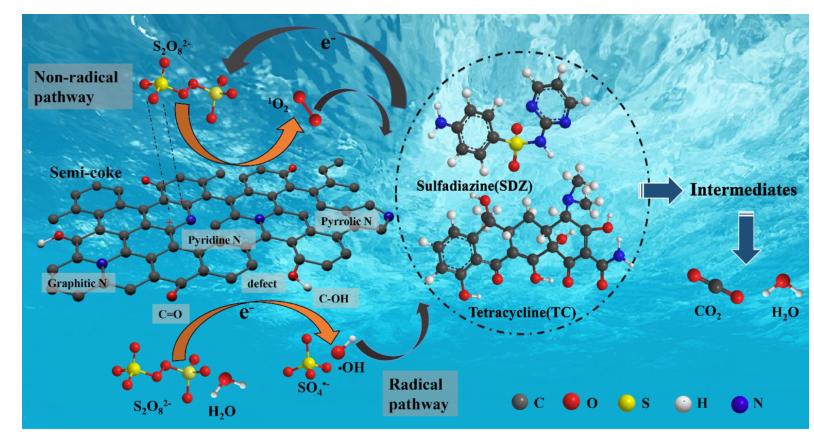水中獸用抗生素磺胺嘧啶(SDZ)和四環(huán)素(TC)難以被生物降解,長期接觸會增加胃、腸、肝、腎損傷風險,給人類健康造成不可逆轉(zhuǎn)危害。傳統(tǒng)的抗生素去除技術(shù)包含生物法、電解法、光催化法等,但都因其高成本和復(fù)雜工藝而受到限制。高級氧化工藝通過生成高活性氧化物種降解有機污染物已成為目前的主流技術(shù),半焦(Semi-coke,SC)是煤化工過程中的固體廢棄物,來源廣泛、成本低廉,可作為礦物生物炭活化過硫酸鹽(PS)生成活性氧(ROS),用于抗生素的高效降解去除。