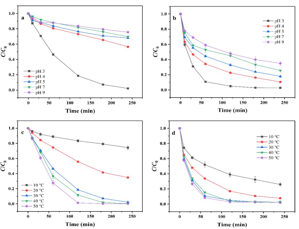 圖5 pH (a, b)和溫度(c, d)與SDZ(a, c)和TC(b, d)降解效率關(guān)系圖