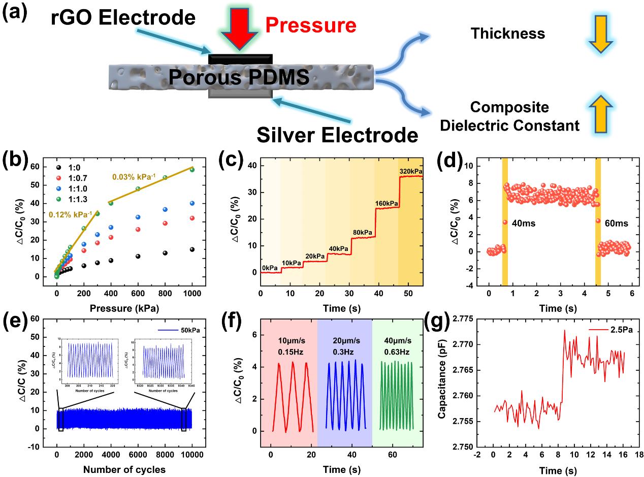 圖4. (a)基于多孔 PDMS 的電容式壓力傳感器的傳感機(jī)制。(b)不同 PDMS/NaCl 混合比例的多孔 PDMS 壓力傳感器的壓力傳感性能。(c)不同壓力梯度下的電容響應(yīng)。(d) 壓力傳感器的快速響應(yīng)和恢復(fù)時(shí)間(小于60 毫秒)。(e)壓力傳感器在 50 kPa 下 進(jìn)行10,000 次循環(huán)的電容響應(yīng)。(f)在不同頻率下進(jìn)行 8 kPa 負(fù)載壓力的電容響應(yīng)。(g) 壓力傳感器的超低壓力檢測(cè)極限(2.5 帕)。