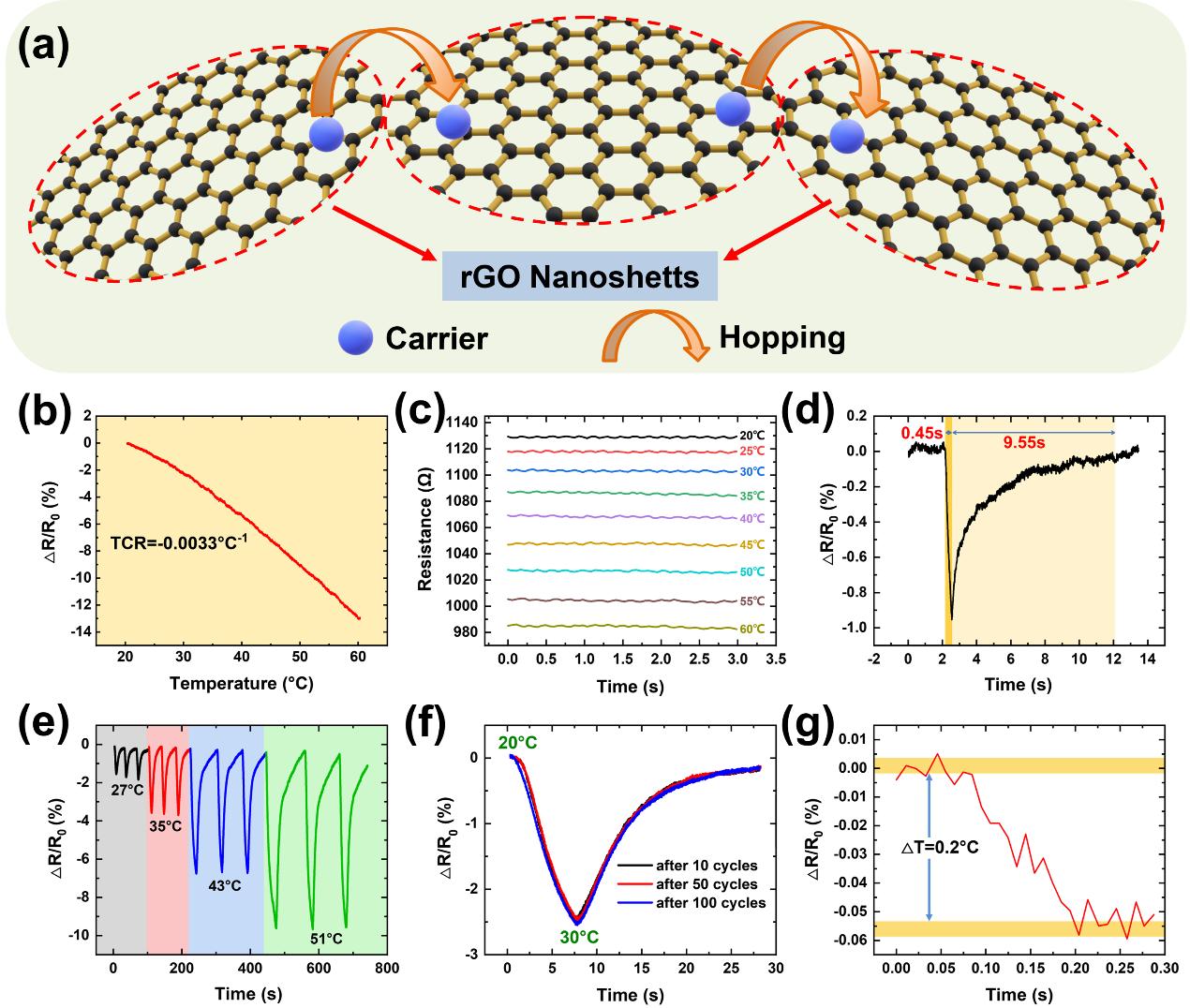 圖5. (a) rGO 納米片的溫度傳感機(jī)制。(b)溫度傳感器的電阻響應(yīng)。(c)不同靜態(tài)溫度梯度下的電阻響應(yīng)。(d)溫度傳感器在 3°C 溫差下的快速響應(yīng)和恢復(fù)時(shí)間。(e)不同動(dòng)態(tài)溫度梯度循環(huán)下的電阻響應(yīng)。(f)循環(huán)不同次后的穩(wěn)定電阻響應(yīng)。(g)溫度傳感器在 0.2°C 溫差下的顯著電阻響應(yīng)。