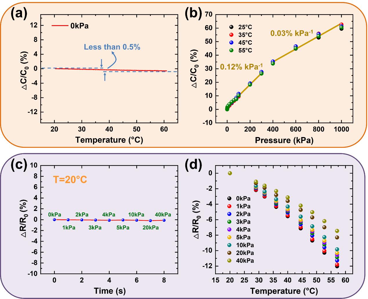 圖6. (a) 雙模態(tài)傳感器在無(wú)負(fù)載情況下的電容隨溫度的變化。(b)在四種溫度下,雙模傳感器的電容響應(yīng)與負(fù)載的函數(shù)關(guān)系。(c)在 0-40 kPa 的壓力下,溫度傳感器在20°C時(shí)的電阻響應(yīng)。(d)溫度傳感器在不同壓力下的電阻響應(yīng)與溫度的函數(shù)關(guān)系。