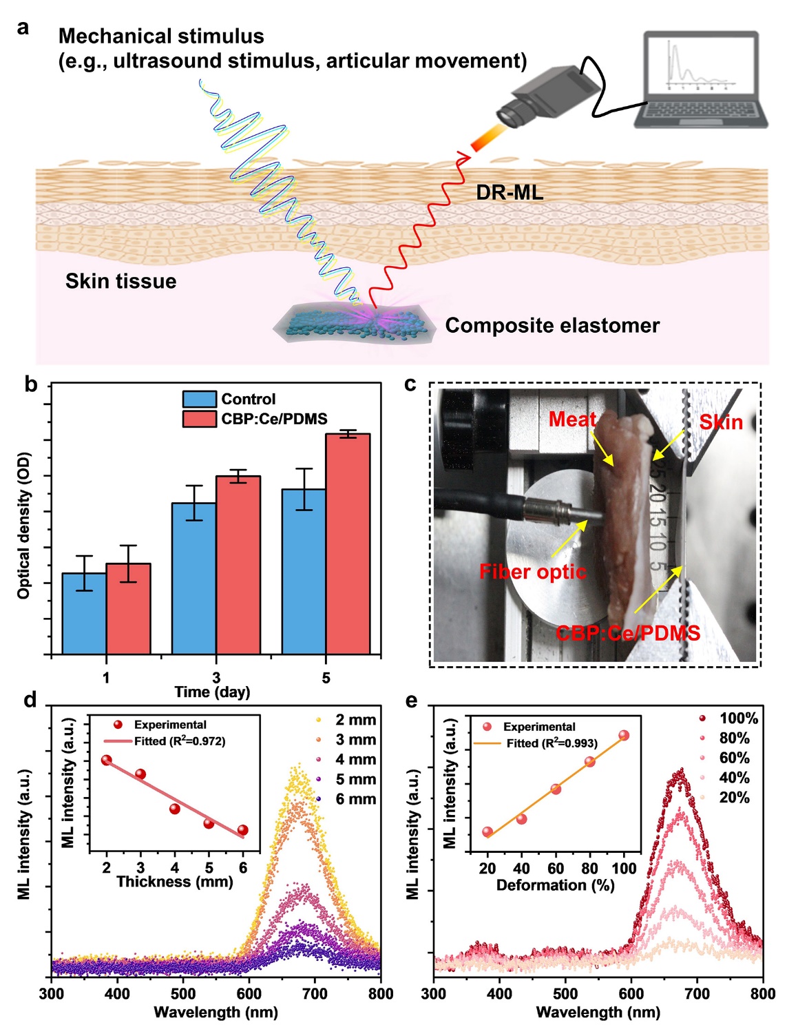 本工作選取豬皮和豬肉組織模擬生物皮膚組織,并在拉伸模式下記錄通過上述組織的力致發(fā)光信號,證明CBP:Ce/PDMS復(fù)合材料發(fā)射的深紅色力致發(fā)光具有很好的穿透性(圖5)。生物相容性實(shí)驗(yàn)表明CBP:Ce/PDMS復(fù)合材料具有理想的生物相容性。深紅色力致發(fā)光的組織滲透和力學(xué)傳感能力方面的演示表明,CBP:Ce/PDMS在生物體原位生物力學(xué)檢測方面具有廣闊的應(yīng)用前景。