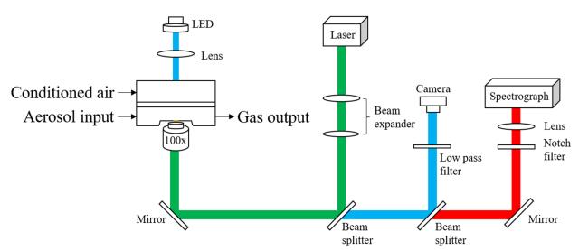 圖1.本研究中使用的氣溶膠光學(xué)鑷裝置示意圖。用霧化器霧化溶液以產(chǎn)生氣溶膠液滴。調(diào)節(jié)后的空氣流由干燥空氣流和通過水加濕的濕潤空氣流混合而成。溫度和濕度傳感器測量調(diào)節(jié)后的空氣流進(jìn)入腔室后的溫度和相對濕度。