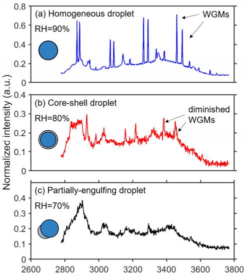 圖2. 3-甲基戊二酸(3-MGA)-II微滴的拉曼光譜:(a)一個(gè)均質(zhì)液滴(相對濕度=90%);(b)一個(gè)核殼液滴(相對濕度=80%);(c)一個(gè)部分包裹的液滴(相對濕度=70%)。WGMs(液滴-玻璃界面波)用黑色箭頭標(biāo)出。