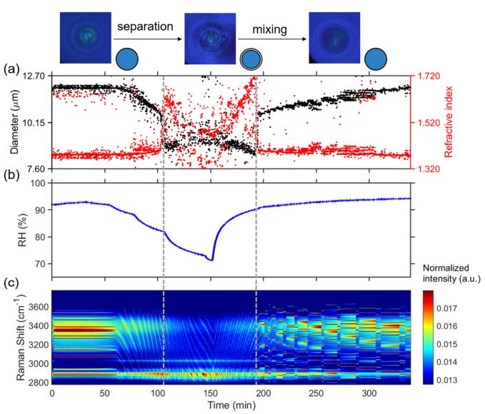 圖3. 水溶3-甲基戊二酸(3-MGA)-II的液-液相分離和混合。相態(tài)示意圖位于本圖的上方。(a) 從擬合WGMs(液滴-玻璃界面波)的拉曼位移位置確定的液滴尺寸和折射率變化的時(shí)間尺度。(b) 在濕度變化過程中,通過捕捉裝置后的相對濕度變化。(c) 時(shí)間分辨拉曼光譜。液滴內(nèi)夾雜物的隨機(jī)運(yùn)動(dòng)停止和由此導(dǎo)致的核殼結(jié)構(gòu)形成,由左側(cè)的灰色虛線指示。右側(cè)的灰色虛線作為液滴形態(tài)從相分離狀態(tài)轉(zhuǎn)變?yōu)榫酄顟B(tài)的點(diǎn)。