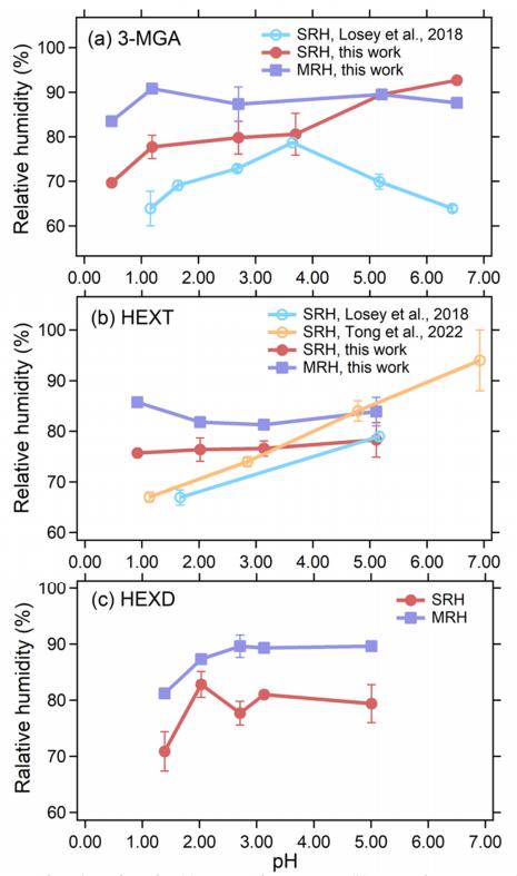 圖4.分離相對濕度(SRHs)和混合相對濕度(MRHs)作為pH值的函數(shù),對應(yīng)于(a) 3-甲基戊二酸(3-MGA)/硫酸銨(AS)系統(tǒng),(b) 己三醇(HEXT)/硫酸銨(AS)系統(tǒng),(c) 己二醇(HEXD)/硫酸銨(AS)系統(tǒng)??招膱A圈引自Losey等人(2018年)和Tong等人(2022年)的數(shù)據(jù)。SRHs和MRHs的誤差條基于多次測量得出。
