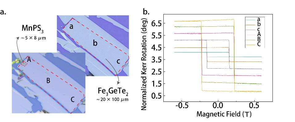 第一部分的探索性實(shí)驗(yàn)如上圖所示分為兩個(gè)階段。第一階段,首先對(duì)厚度約24 nm的FGT薄片進(jìn)行磁性表征;第二階段向FGT上方轉(zhuǎn)移一層約13 nm厚度的MPS(MnPS3),并再次測(cè)試被MPS覆蓋和未覆蓋區(qū)域的磁性。結(jié)果表明,覆蓋了MPS之后,覆蓋和未覆蓋區(qū)域的磁性均受到了相同程度的調(diào)制。