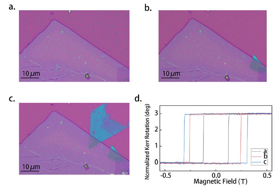 多重調(diào)控的可能性也經(jīng)過(guò)了實(shí)驗(yàn)驗(yàn)證,如上圖所示。通過(guò)逐步向FGT薄膜上轉(zhuǎn)移反鐵磁層,能夠?qū)ζ浯判赃M(jìn)行連續(xù)調(diào)控。