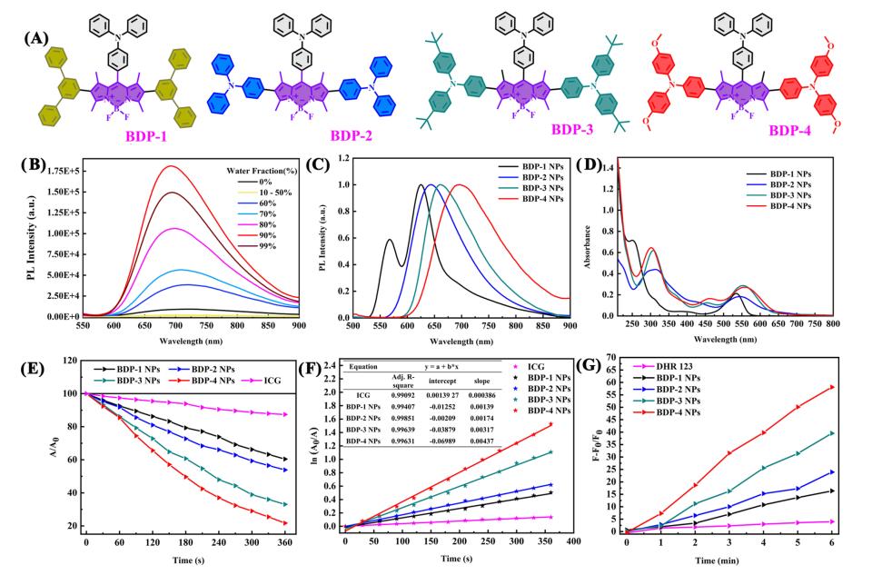 · 具有聚集誘導(dǎo)近紅外發(fā)光性質(zhì)有機(jī)分子的制備及光物理性質(zhì)研究成功通過化學(xué)修飾來調(diào)節(jié)BODIPY的光物理性質(zhì)和產(chǎn)生1O2的能力,從而優(yōu)化其發(fā)光性能。由于BDP-4具有亮近紅外熒光發(fā)射,高的熒光量子產(chǎn)率,良好的1O2生成能力,為實(shí)現(xiàn)AIE長余輝在腦卒中的廣泛應(yīng)用奠定了良好基礎(chǔ)。