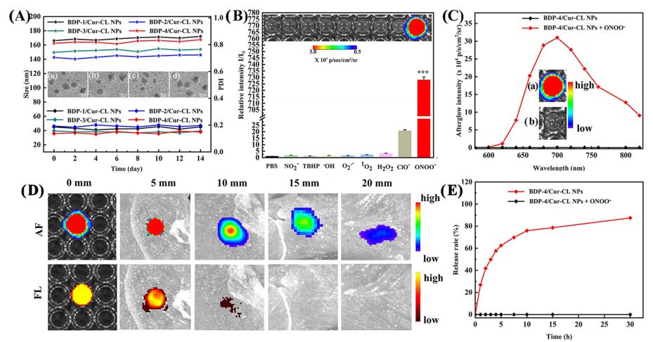 通過引入具有特異性O(shè)NOO−響應(yīng)基元,實(shí)現(xiàn)對化學(xué)發(fā)光型探針的發(fā)光強(qiáng)度、發(fā)射波長、發(fā)光效率、發(fā)光時(shí)間和特異性響應(yīng)性質(zhì)的調(diào)控。之后,將其與姜黃素通過可響應(yīng)性斷裂的化學(xué)鍵連接,設(shè)計(jì)合成出新穎的對ONOO−具有特異性選擇性啟亮功能的化學(xué)發(fā)光探針分子BDP-4/Cur-CL。在沒有ONOO-的情況下,余輝信號和姜黃素的釋放不會發(fā)生,但在ONOO−刺激下,亮度高達(dá)732倍,姜黃素的釋放率到達(dá)86%。BDP-4/Cur-CL NP表現(xiàn)出明亮的近紅外余輝發(fā)光(697nm)、極好的靈敏度(LOD=82.67nM)、高能量轉(zhuǎn)移效率(94.6%)、深組織穿透(20mm),有望為在腦卒中精準(zhǔn)診療提供新材料和新思路。