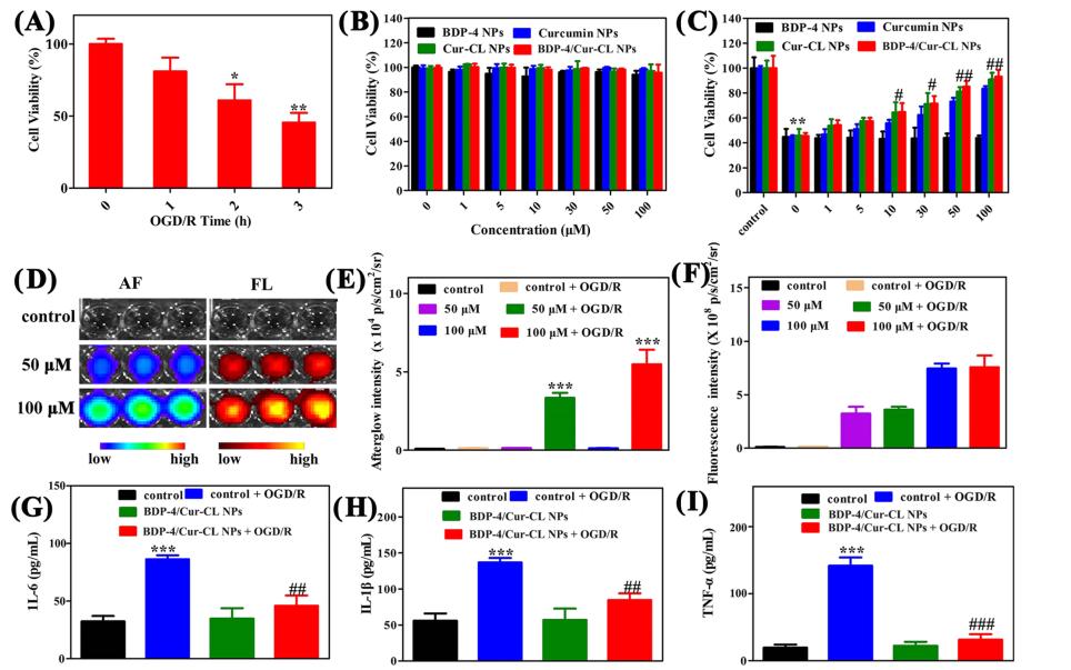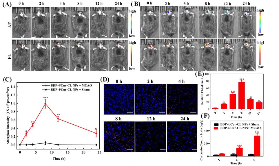 作者設(shè)計(jì)了由BDP-4和Cur-CL單元組成的ONOO−激活的近紅外余輝圖像引導(dǎo)納米顆粒(命名為BDP-4/Cur-CL NPs)。該系統(tǒng)可以特異性和敏感性地評估內(nèi)源性O(shè)NOO-水平,以揭示I/R腦損傷的進(jìn)展,并動態(tài)監(jiān)測姜黃素的釋放,以進(jìn)行安全的IS治療。BDP-4/Cur-CL NPs表現(xiàn)出明亮的NIR余輝發(fā)光(*大增加732倍)、高靈敏度(檢測極限,LOD=82.67nM)、高能量轉(zhuǎn)移效率(94.6%)、深層組織穿透(20mm)以及突出的抗凋亡和抗炎作用。通過使用這種復(fù)雜的設(shè)計(jì),BDP-4/Cur-CL NPs在小鼠體內(nèi)I/R腦損傷的發(fā)生和發(fā)展過程中激活NIR余輝信號并提供三重功能:(i)準(zhǔn)確區(qū)分i/R損傷和正常區(qū)域;(ii)內(nèi)源性的實(shí)時(shí)報(bào)告病變區(qū)域的ONOO−水平;(iii)動態(tài)姜黃素釋放狀態(tài)的監(jiān)測。此外BDP-4/Cur-CL NPs有效降低細(xì)胞凋亡,增強(qiáng)存活率,減輕神經(jīng)炎癥,減少梗死體積和增強(qiáng)的卒中結(jié)果。