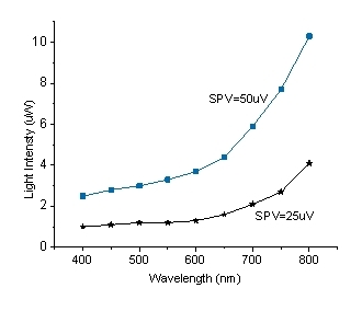 圖3 表面光電壓強(qiáng)度SPV=25uV/50uV下,測(cè)量并繪制光強(qiáng)值和波長(zhǎng)的曲線圖