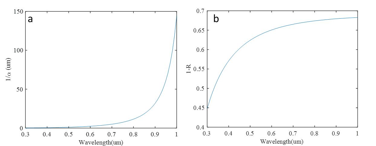圖4a根據(jù)公式1得到吸收系數(shù)的倒數(shù)和波長(zhǎng)的關(guān)系; 圖4b根據(jù)公式2得到(1-R(λ))和波長(zhǎng)的關(guān)系。