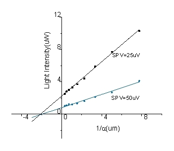 圖5計(jì)算得到穿透深度()和光強(qiáng)的依賴關(guān)系圖,利用外推法可到高摻雜單晶硅的擴(kuò)散長(zhǎng)度約在2um