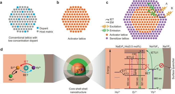 圖1. 基于界面能量傳遞的發(fā)光模型設(shè)計(jì)。a,b)常規(guī)低濃度摻雜與發(fā)光基質(zhì);c)基于界面能量傳遞(IET)的核殼結(jié)構(gòu)設(shè)計(jì);d)NaErF4:Ho(0.5 mol%)@NaYbF4@NaYF4核-殼-殼納米粒子及能量過(guò)程示意圖。