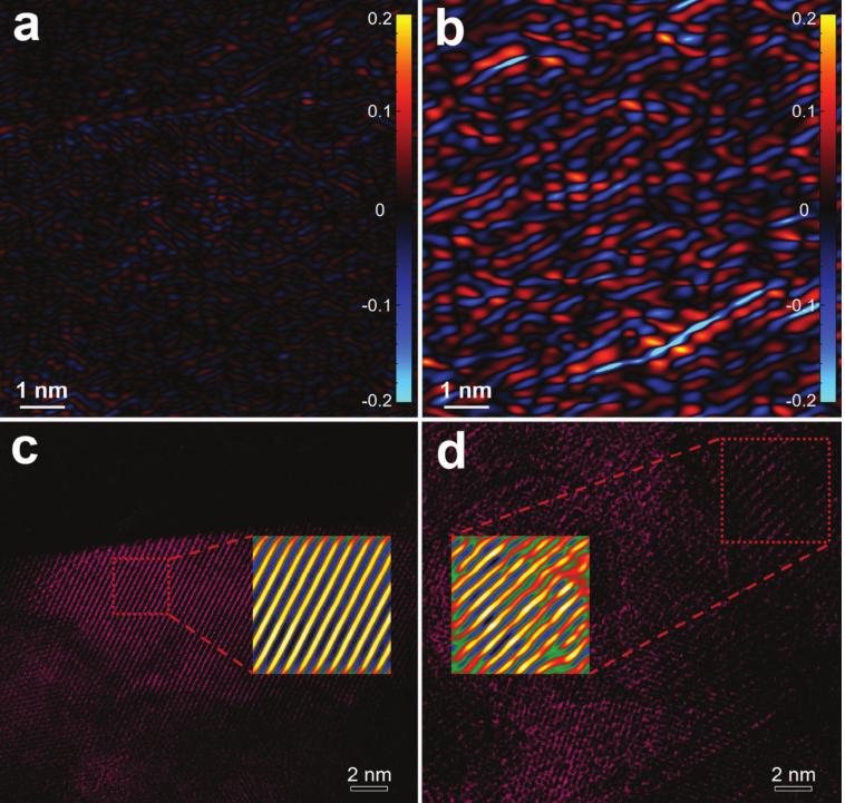 圖1. GPA圖a) cub-MnO2;b) com-MnO2; HRTEM圖c) cub-MnO2;d) com-MnO2