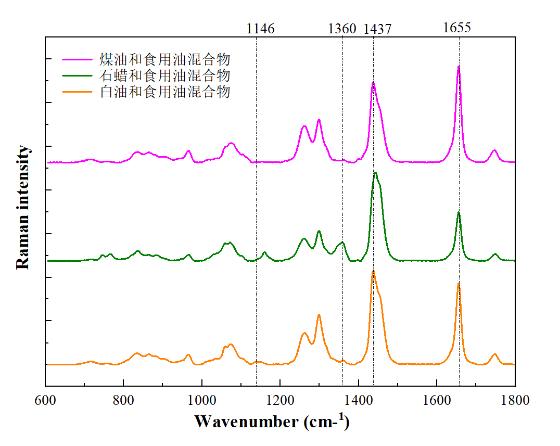 檢測不同工業(yè)油與食用油混合物的拉曼光譜圖如圖2所示。在三種混合物中均發(fā)現(xiàn)了1655cm-1和1745cm-1峰位處的食用油拉曼特征峰,表明三種混合物中均有食用油摻雜。此外,1146 cm-1峰位的白油拉曼峰、1360 cm-1峰位的石蠟拉曼峰、1437cm-1峰位可與圖1中的純品油拉曼峰相指認,作為油混合物的識別依據(jù)。