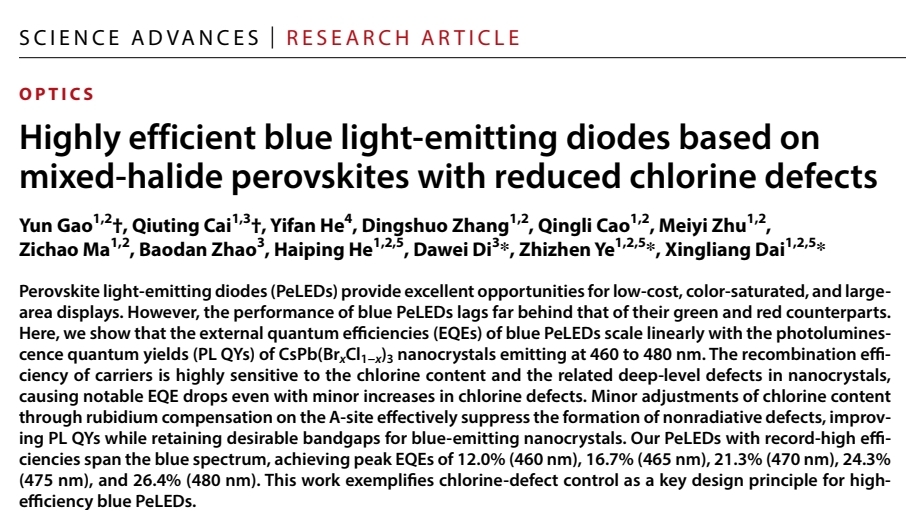 近日,浙江大學(xué)材料學(xué)院葉志鎮(zhèn)院士團(tuán)隊(duì)在藍(lán)光發(fā)光二極管效率提升方面取得重要進(jìn)展,研究成果以“Highly efficient blue light-emitting diodes based on mixed-halide perovskites with reduced chlorine defects”為題發(fā)表在國際**期刊Science Advances (doi:10.1126/sciadv.ado5645)上。浙江大學(xué)為該論文第一單位,高贇博士與蔡秋婷博士為共同第一作者,葉志鎮(zhèn)院士、戴興良研究員、狄大衛(wèi)教授為共同通訊作者。