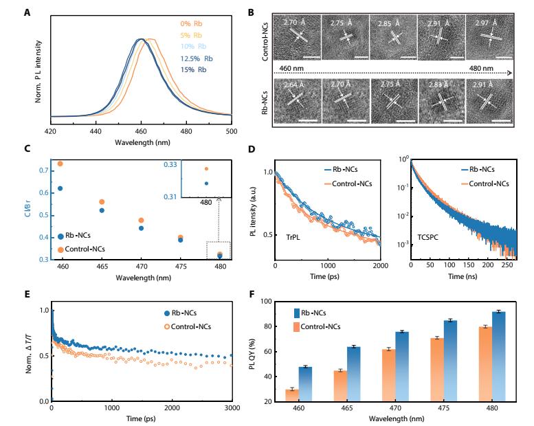 團(tuán)隊(duì)以不同時(shí)間尺度下的光譜觀察了氯含量與氯缺陷及材料光學(xué)性能之間的變化與聯(lián)系,得出氯含量與納米晶薄膜中缺陷及熒光量子產(chǎn)率呈負(fù)相關(guān)的定性關(guān)系,并提出一條提升藍(lán)光LED器件性能的關(guān)鍵思路,即降低氯含量來抑制氯缺陷。通過A位銣補(bǔ)償策略,在保證CsPb(BrxCl1-x )3納米晶發(fā)光波長沒有偏移的情況下有效降低了氯含量,明顯抑制了缺陷,提升納米晶光學(xué)性能。