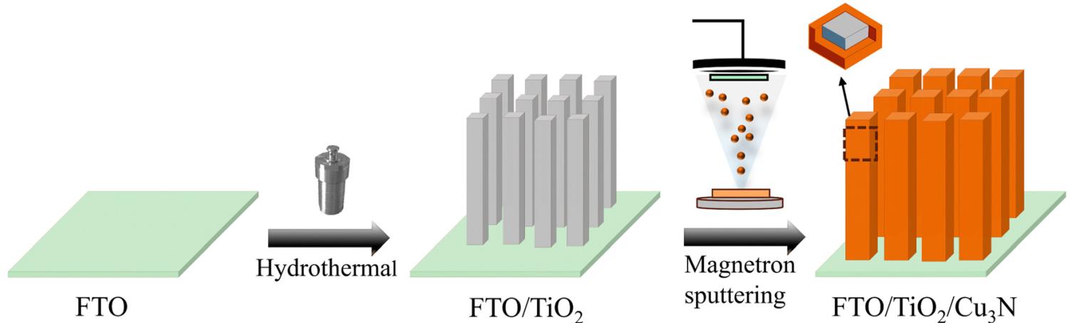 針對上述科學(xué)問題,湖北工業(yè)大學(xué)理學(xué)院(芯片產(chǎn)業(yè)學(xué)院)程正旺等提出了一種基于匹配帶隙和功函數(shù)的p-n異質(zhì)結(jié),不僅促進(jìn)了可見光吸收,還極大地提高了光生載流子的分離與遷移效率,實現(xiàn)了高效、穩(wěn)定的PEC可見光析氫。該工作以“Construction of nanorod-shaped TiO2/Cu3N p–n heterojunction for efficient visible-light hydrogen evolution”為題發(fā)表在國際期刊Journal of Materials Chemistry C上。
