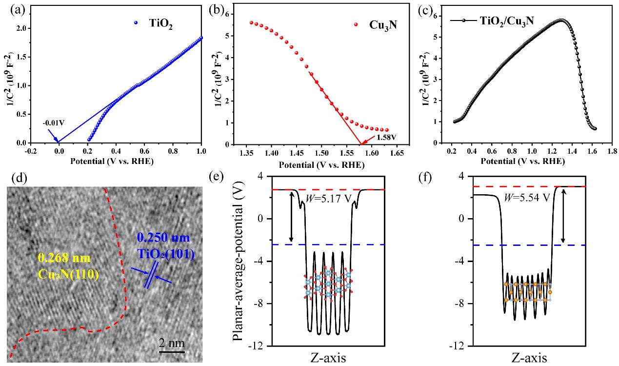 圖3. TiO2 (a),Cu3N (b)和TiO2/Cu3N的莫特-肖特基曲線(MS);TiO2/Cu3N界面的TEM圖像;理論計算的平面平均電勢,(e) TiO2(101),(f) Cu3N(110)。