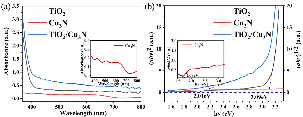 圖4. 直接帶隙TiO2、TiO2/Cu3N ((αhν)2~hν)和間接帶隙Cu3N ((αhν)1/2~hν)的紫外-可見漫反射光譜(DRS) (a)和相應(yīng)的Tauc圖(b)。