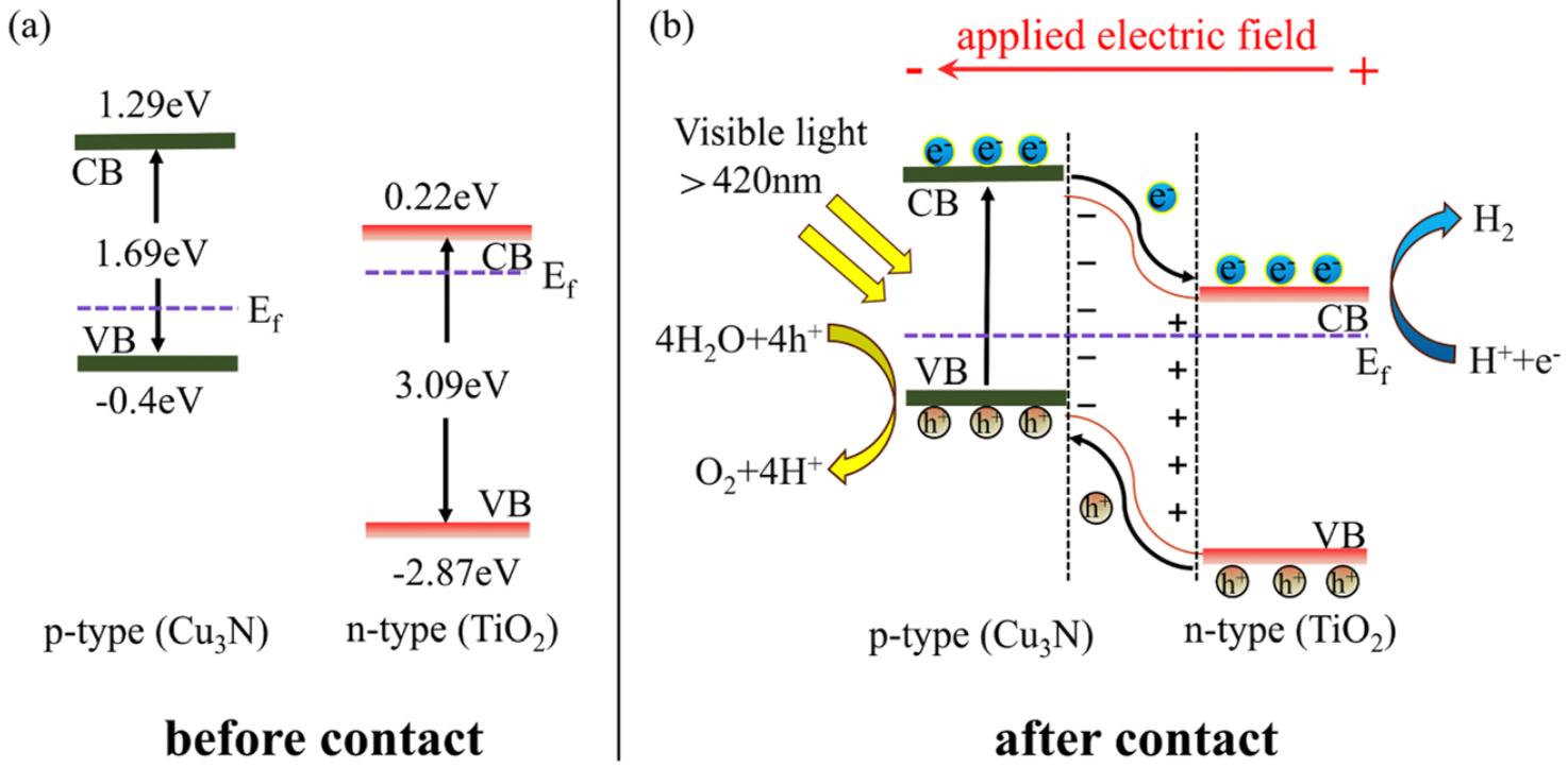 圖8. > 420 nm可見光照射下,TiO2/Cu3N p-n異質(zhì)結(jié)的光生載流子遷移與光電催化分解水析氫機(jī)理圖。
