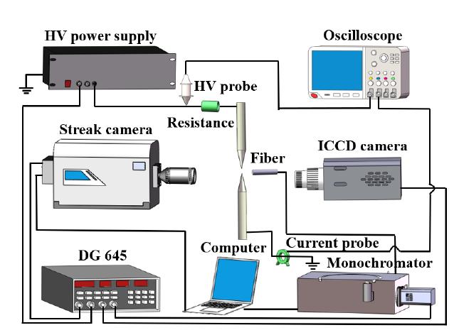 實(shí)驗(yàn)裝置圖如下圖所示,放電電極由兩根鎢針組成,電極間隙控制在2mm,火花放電由納秒脈沖電源驅(qū)動(dòng)產(chǎn)生。利用DG645同步納秒脈沖電源、條紋相機(jī)以及ICCD相機(jī)捕獲火花放電超快擊穿過程以及放電模式演化過程的圖像,同時(shí),利用DG645同步納秒脈沖電源以及發(fā)射光譜儀完成對(duì)放電過程中產(chǎn)生的活性粒子的產(chǎn)生和淬滅過程的診斷。。