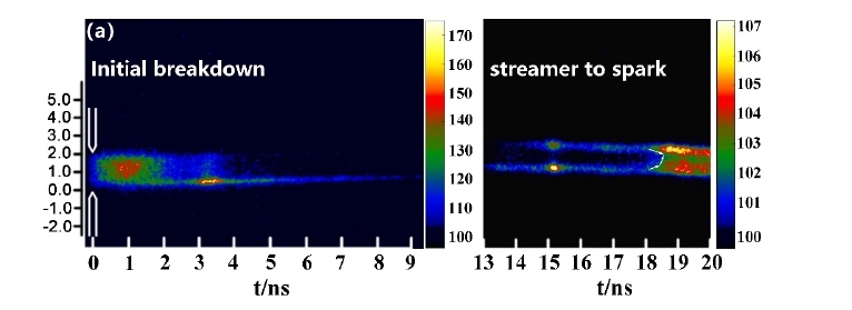 當(dāng)把條紋相機(jī)開到10ns的時(shí)間窗口下時(shí)(Δ t=100 ps),可更加清晰地觀測(cè)到火花放電通道的擊穿和產(chǎn)生的過程(圖4)。圖中可見在陰極亮斑出現(xiàn)之前存在一個(gè)均勻放電的階段,這個(gè)階段大概持續(xù)了1.8ns,而這個(gè)階段在圖2中無法被ICCD相機(jī)分辨出來。條紋相機(jī)圖像清楚地揭示了火花通道形成的五個(gè)過程。(1)初始均勻放電階段;(2)陰極亮斑的出現(xiàn);(3)兩個(gè)電極附近陰極絲及陽(yáng)極絲的出現(xiàn);(4)陰極絲及陽(yáng)極絲的傳播;(5)陰極絲及陽(yáng)極絲的匯合以及火花放電通道的形成。