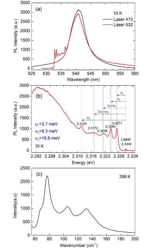 圖5 CsPb2Br5微球的拉曼光譜。 (a) 473和532 nm激光在10 K激發(fā)下的PL光譜 (b) 532 nm激發(fā)的共振拉曼信號;(c)室溫下632.8 nm激發(fā)下的拉曼光譜信號