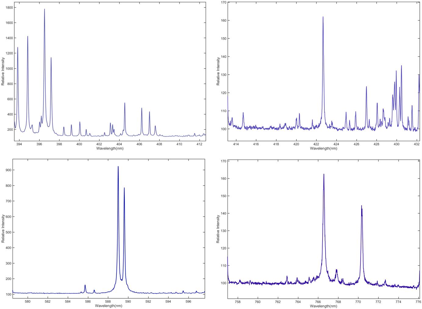 在土壤樣品測量過程中,為保證土壤樣品的均勻性,對土壤樣品進行烘干研磨過篩以及壓片后進行測量。為獲得較好的光譜信號,我們采用激光能量為50 mJ,SCMOS信號采集延時和門寬分別為1 us和5 us,光柵刻線選擇1200 lines/mm。*終土壤樣品光譜信號結(jié)果如圖3所示。