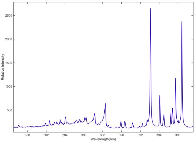 此外,我們還對含氮樣品進行了分析,設(shè)置光譜儀中心波長為388 nm,采集CN分子光譜信號,如圖所示可以看出,采用該光譜儀可獲得明顯的CN分子光譜信號以及Al、Ca等原子光譜信號。
