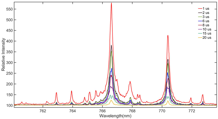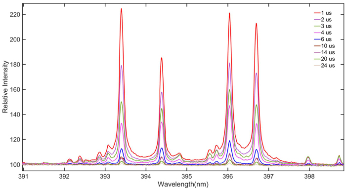 此外,我們還采集了Ca、Al以及K元素在不同延時下的光譜信號,如圖5及圖6所示。可以看出,隨著采集延時的逐漸增大,光譜信號逐漸減弱,能夠有效實現(xiàn)us級別光譜信號時間分辨。