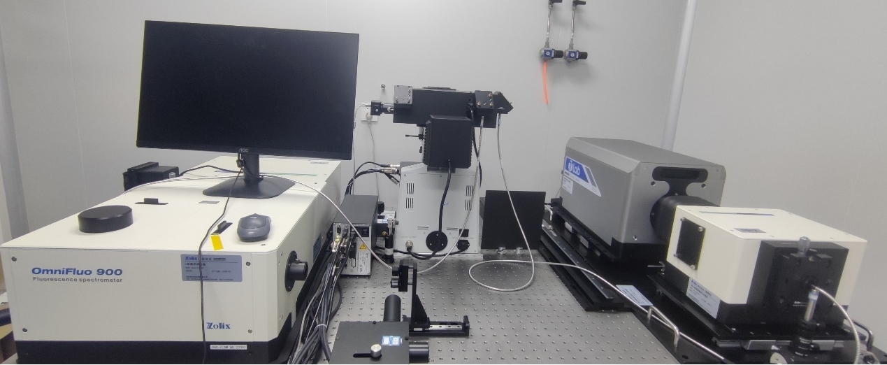 下圖為秦川江研究員課題組的OmniFluo900系列穩(wěn)態(tài)瞬態(tài)熒光光譜儀,耦合正置科研級顯微鏡,條紋相機及飛秒激光器。該套系統(tǒng)主要用于雜化半導(dǎo)體和有機光電材料與器件的研究。