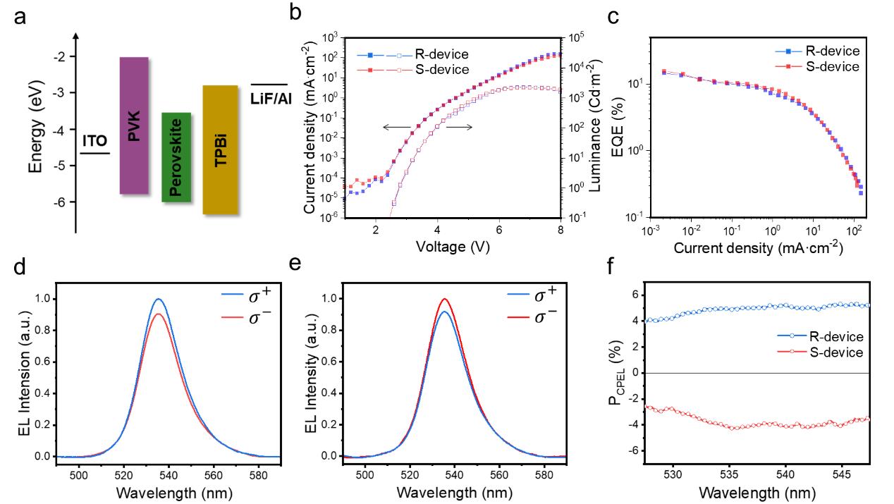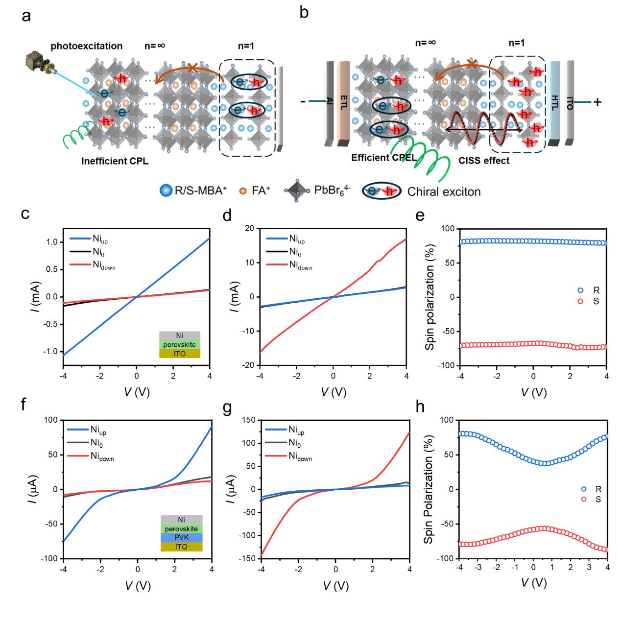 近年來,可溶液加工的手性金屬鹵化物鈣鈦礦在室溫條件下展現(xiàn)出優(yōu)異的手性誘導(dǎo)自旋選擇性(CISS)而備受關(guān)注。通過這種特性,緊湊的LED器件也能夠直接操縱注入電子的自旋態(tài),實現(xiàn)高效的圓偏振電致發(fā)光(CP-EL)。該技術(shù)在3D顯示、虛擬現(xiàn)實技術(shù)等領(lǐng)域有潛在的應(yīng)用。然而,目前基于手性鈣鈦礦的自旋發(fā)光二極管中實現(xiàn)高外量子效率(EQE)和高CP-EL仍然是一個重要挑戰(zhàn)。