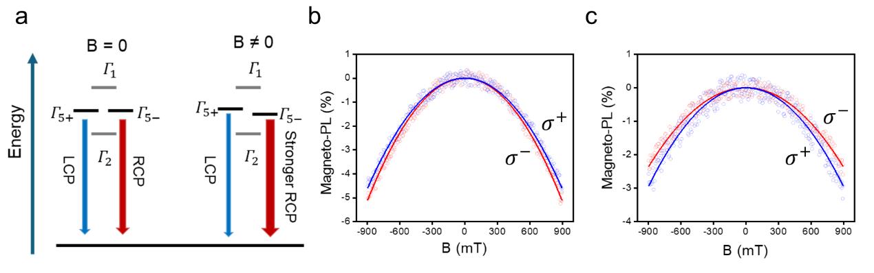 同時該團隊通過磁場依賴光譜和自旋軌道理論的結(jié)合,進一步量化了手性鈣鈦礦(R/S-MBA?FA?Pb?Br??)中的自旋行為,結(jié)果表明材料的載流子自旋壽命達20 ps。磁場作用下,自旋注入與產(chǎn)生的圓偏振發(fā)射之間呈現(xiàn)直接相關(guān)關(guān)系。