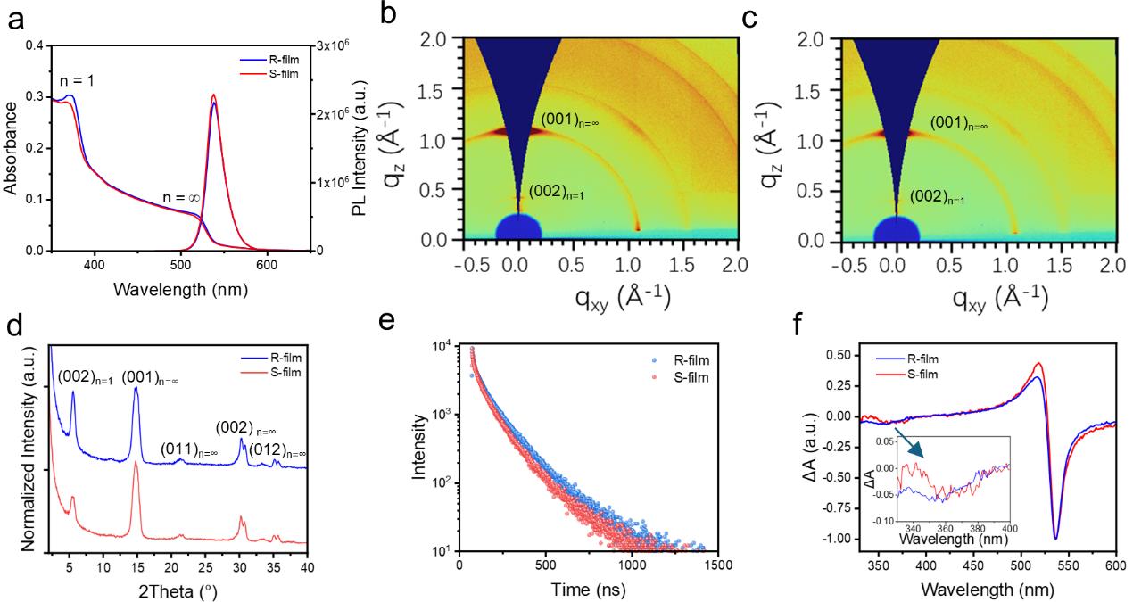 手性鈣鈦礦材料的相結(jié)構(gòu)與手性誘導(dǎo)的自旋軌道耦合(CISOC)效應(yīng)在自旋操控中具有重要作用。研究團隊通過廣角X射線掠入射小角散射(GIWAXS)和X射線衍射(XRD)技術(shù),解析了手性鈣鈦礦薄膜的多相結(jié)構(gòu),發(fā)現(xiàn)n = 1相位于薄膜的底界面,而3D相位則主要作為復(fù)合和發(fā)光中心。這種獨特的垂直相結(jié)構(gòu)分布有利于材料的自旋選擇性。