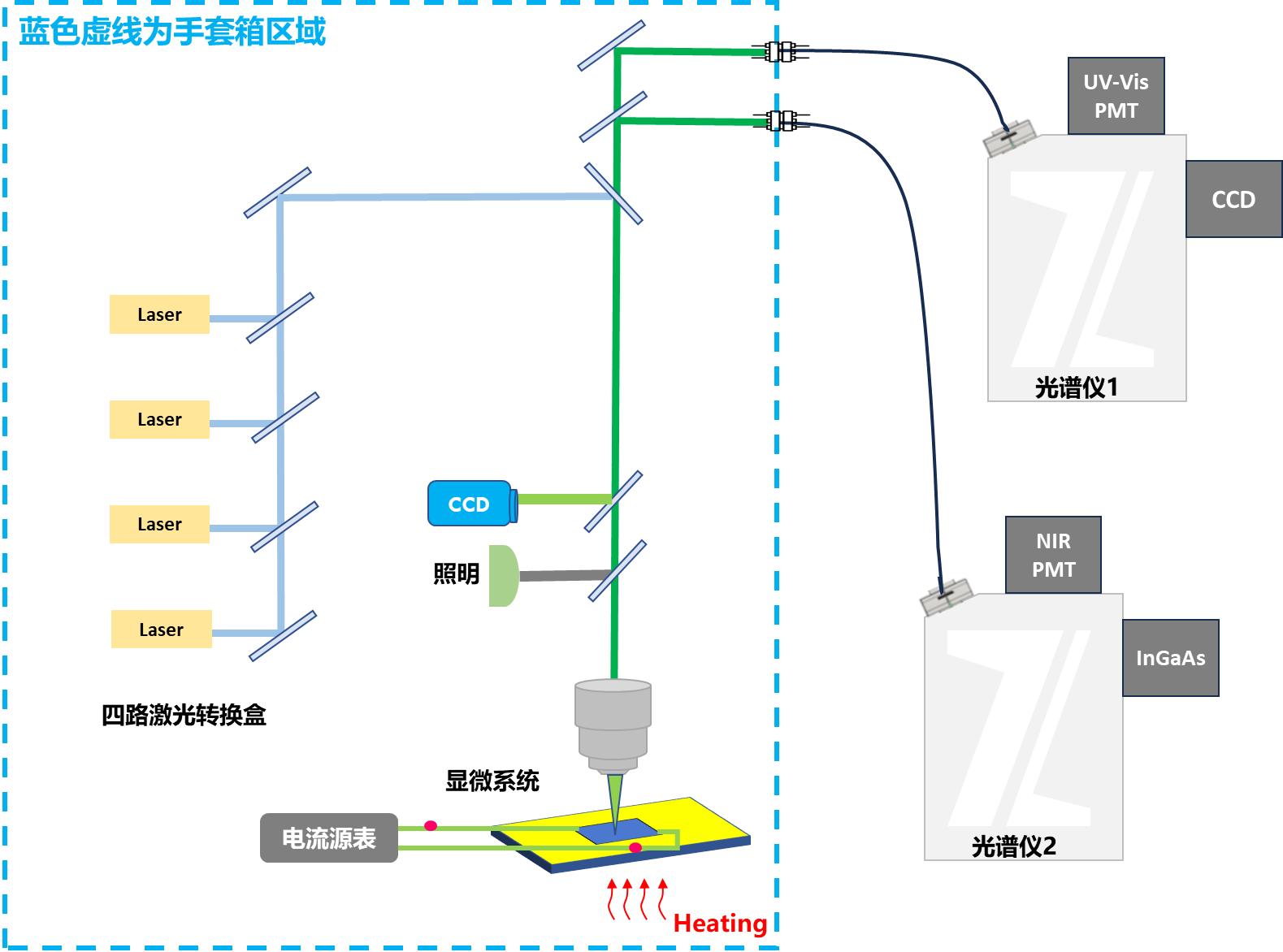 圖1. 手套箱-顯微原位穩(wěn)態(tài)瞬態(tài)熒光及光電流測試系統(tǒng)