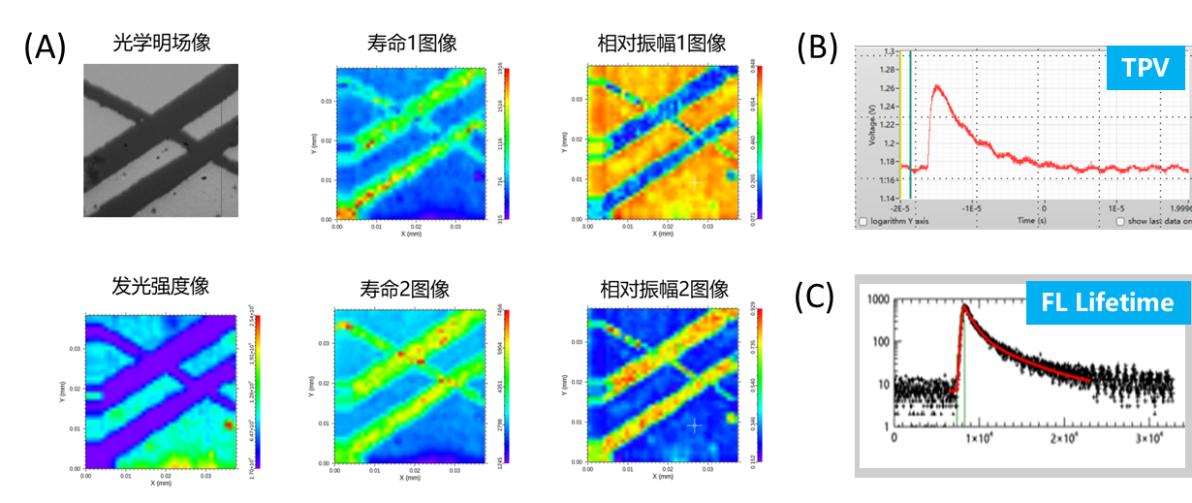圖2.(A)熒光壽命成像;(B)瞬態(tài)光電壓測試;(C)熒光壽命測試