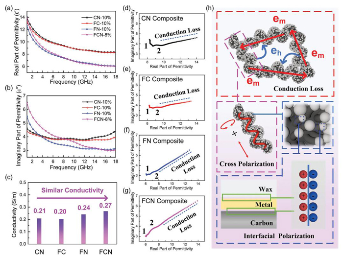 圖六:a)介電常數(shù)實部,b)介電常數(shù)虛部,c) CN、FC、FN和FCN復(fù)合材料的電導(dǎo)率;d) CN, e) FC, f) FN, g) FCN復(fù)合材料的Cole-Cole圖;H)樣品介電損耗機理示意圖。
