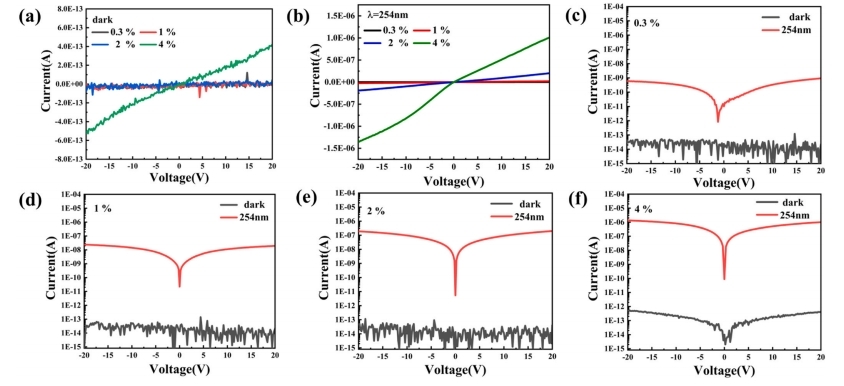 圖1. 在(a)黑暗和(b)254納米光照下,不同溶液中Si-Ga原子比例的樣品顯示出線性I-V特性。α-Ga2O3紫外探測(cè)器在黑暗和254納米光照下的I-V特性:(c) 0.3%,(d) 1%,(e) 2%和(f) 4%硅摻雜α-Ga2O3。