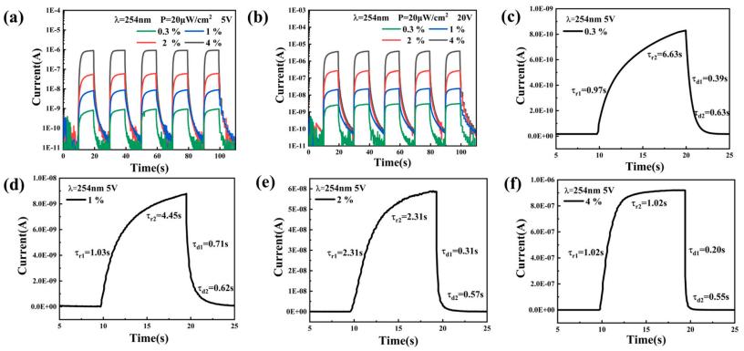 圖2. 在254納米和20微瓦/平方厘米光照射下,不同溶液中Si-Ga原子比例的α-Ga2O3:Si光電探測(cè)器在偏壓(a) 5V和(b) 20V下的光響應(yīng)的時(shí)間變化特性。在5V偏壓下,254納米、20微瓦/平方厘米光照中單周期內(nèi)(c) 0.3%,(d) 1%,(e) 2%和(f) 4%的瞬態(tài)響應(yīng)的放大。