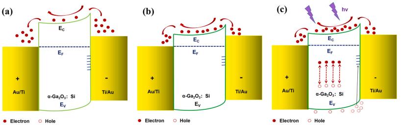 圖3. MSM光電探測(cè)器載流子傳輸和能帶示意圖:(a) 低摻雜濃度在黑暗條件下,(b) 高摻雜濃度在黑暗條件下,以及 (c) 紫外光條件下。