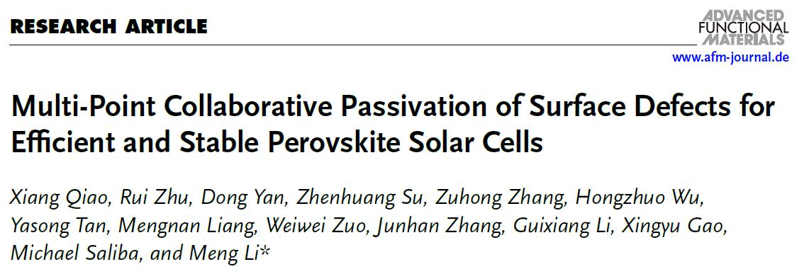 近期,河南大學(xué)納米科學(xué)與材料工程學(xué)院李萌課題組在鉛鹵化物鈣鈦礦太陽(yáng)能電池領(lǐng)域取得新進(jìn)展,相關(guān)成果以“ Multi-point collaborative passivation of surface defects for efficient and stable perovskite solar cells”為題,以Research Article形式在國(guó)際頂級(jí)期刊《先進(jìn)功能材料》(Advanced Function Materials)上發(fā)表。