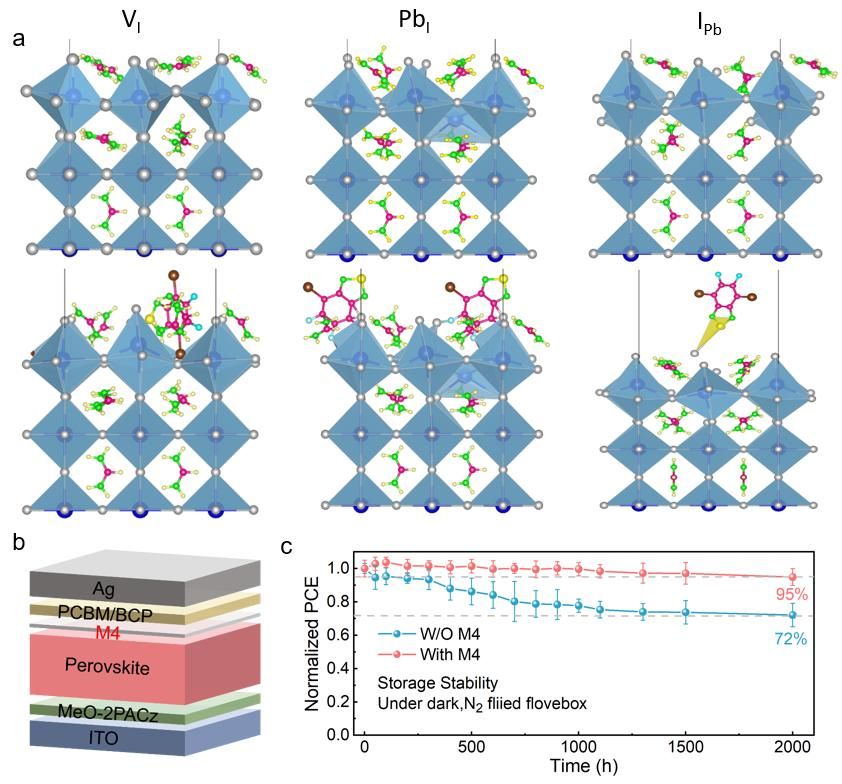 針對(duì)上述問(wèn)題,課題組選擇了一種具有多個(gè)活性位點(diǎn)的有機(jī)小分子(4,7-溴-5,6-氟-2,1,3-苯丙噻二唑)M4來(lái)鈍化鉛碘反位缺陷和碘空位缺陷。我們發(fā)現(xiàn),M4中的溴(Br)和氟(F)基團(tuán)可以與鉛(Pb)相互作用,糾正晶格畸變并鈍化碘空位(VI)缺陷和PbI缺陷。硫(S)基團(tuán)與碘協(xié)調(diào),減少I(mǎi)-I二聚體并鈍化IPb缺陷。經(jīng)過(guò)M4優(yōu)化后的器件效率達(dá)到了25.1%。在氮?dú)猸h(huán)境中儲(chǔ)存2000小時(shí)后,該器件保持了其初始效率的95%??傮w而言,這項(xiàng)工作突出了鈣鈦礦中多位點(diǎn)協(xié)同鈍化的優(yōu)勢(shì),并為鈣鈦礦鈍 化策略提供了一種新方法。