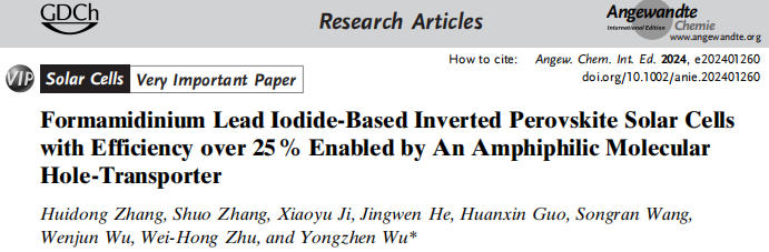 相關(guān)成果以“基于兩親性分子空穴傳輸材料的甲酰胺鉛碘化物鈣鈦礦太陽能電池效率超過25%”為題發(fā)表于國際知名期刊Angew. Chem. Int. Ed.。原文鏈接:https://doi.org/10.1002/anie.202401260。希望該研究能為您的科學(xué)研究或工業(yè)生產(chǎn)帶來一些靈感和啟發(fā)。