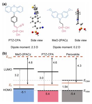 研究人員設(shè)計了一種基于苯并噻嗪(PTZ)的兩親性分子空穴傳輸材料PTZ-CPA,其結(jié)構(gòu)中含有氰基乙烯基膦酸(CPA)基團(tuán)。與之前常用的咔唑基空穴傳輸材料MeO-2PACz相比,PTZ-CPA展現(xiàn)出更高的分子偶極矩(~2.3 D),這有助于在ITO/HTL/鈣鈦礦界面處更有效地傳輸空穴。此外,PTZ-CPA的HOMO能級更深(-5.50 eV),與FAPbI3的價帶*大值(VBM)對齊更好,從而優(yōu)化了界面處的空穴收集效率。