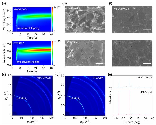 圖2 HTLs對FAPbI?鈣鈦礦沉積的影響。(a)在旋涂過程中沉積于MeO-2PACz上的FAPbI?鈣鈦礦薄膜的原位光致發(fā)光(PL)光譜。(b)沉積于MeO-2PACz上的FAPbI?鈣鈦礦薄膜的俯視掃描電子顯微鏡(SEM)圖像(標(biāo)尺為1微米)。(c)沉積于MeO-2PACz上的FAPbI?鈣鈦礦薄膜的掠入射廣角X射線散射(GIWAXS)圖案。(d)沉積于PTZ-CPA上的FAPbI?鈣鈦礦薄膜的GIWAXS圖案。(e)沉積于MeO-2PACz和PTZ-CPA上的FAPbI?鈣鈦礦薄膜的X射線衍射(XRD)圖案。(f)沉積于MeO-2PACz和PTZ-CPA上的FAPbI?鈣鈦礦薄膜底部表面的俯視SEM圖像(標(biāo)尺為1微米)。