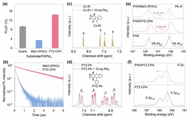 圖3. 光致發(fā)光(PL)特性與分子間相互作用。(a)沉積在石英玻璃和兩種空穴傳輸層(HTLs)上的FAPbI?鈣鈦礦薄膜的光致發(fā)光量子產(chǎn)率(PLQY,激發(fā)波長為405 nm);(b)時間分辨光致發(fā)光(TRPL)衰減測量(激發(fā)波長為510 nm)。在DMSO-d?中的下場¹H核磁共振(NMR)譜圖:(c)Cz-Et(0.01 mM)以及(d)PTZ-Ph(0.01 mM),分別在有無PbI?(0.1 mM)的條件下。X射線光電子能譜(XPS):(e)來自原始FAPbI?鈣鈦礦薄膜以及涂覆有MeO-2PACz和PTZ-CPA的薄膜的Pb 4f信號;(f)來自PTZ-CPA薄膜以及涂覆有PTZ-CPA的FAPbI?鈣鈦礦薄膜的S 2p信號。