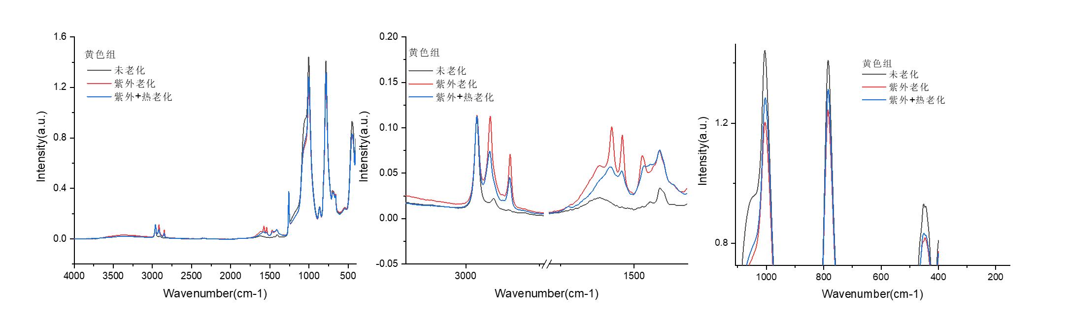 從圖2-4可以看到,通過(guò)紫外光照以及熱處理后, 組樣品老化以后在1258cm-1、1000cm-1以及784cm-1處峰強(qiáng)稍微變?nèi)酰?紅色組樣品在1000cm-1和784cm-1處峰強(qiáng)明顯變?nèi)?;黃色組紅色樣品1000cm-1、784cm-1以及448cm-1處峰強(qiáng)稍微變?nèi)醺黠@。結(jié)果表明在紫光光照下,樣品主鏈Si-0-Si(1000cm-1)和側(cè)鏈Si-C(1258cm-1)有部分發(fā)生斷裂,另外紅色組樣品C-H鍵(3000cm-1)在2850cm-1等處出現(xiàn)新的小峰,說(shuō)明C-H發(fā)生部分氧化,造成醛基等新的化學(xué)鍵形成。
